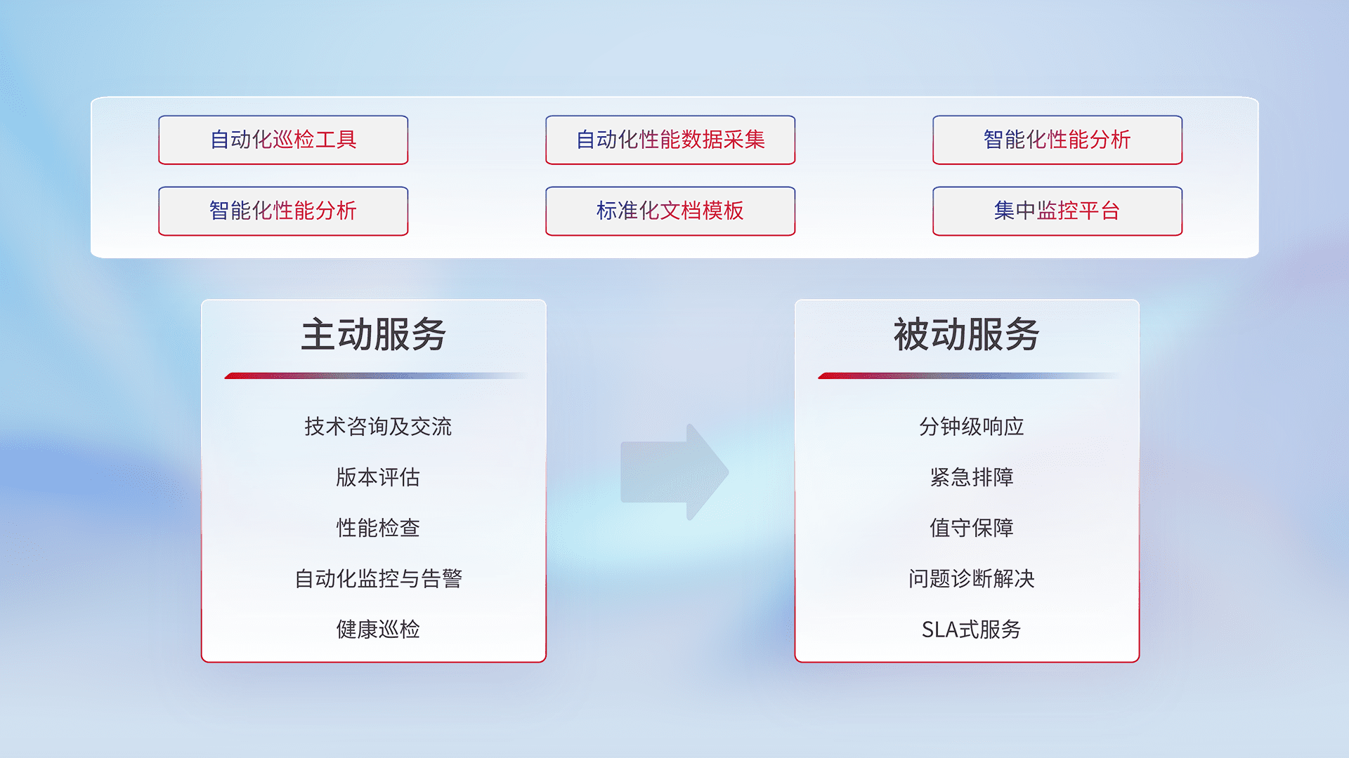 智能化工具和标准化文档,,,,保障服务质量,,,,提供主动服务(包含技术咨询、、、、版本评估、、、性能检查、、自动化监控与告警、、健康巡检)和被动服务包含(分钟级响应、、、、紧急排障、、、、值守保障、、、、问题诊断解决、、、、SLA服务)。。。。